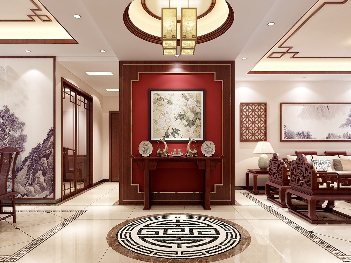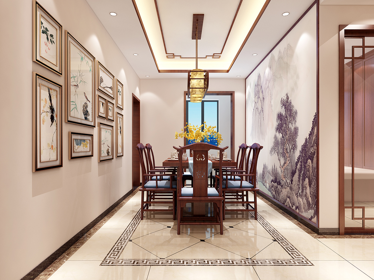本案為中式古典,材質(zhì)與顏色的選用以和諧為原則、無累贅冗余造型,溫馨的手法,保留中式風(fēng)格所需要的必要的元素,在使用面積比例上推陳出新,結(jié)合配飾上力求指引居室的主人以輕松、愉快的狀態(tài)流連于居室營造的氣氛中。客餐廳十分淡雅,這里沒有多余的色彩、布置和家具,沒有喧囂與繁冗,一派寧靜悠遠(yuǎn);設(shè)計(jì)將原本不規(guī)則且略顯零亂的天花加以簡化整合;設(shè)計(jì)采用傳統(tǒng)的入戶玄關(guān)門廳把客廳與餐廳兩個空間加以適當(dāng)區(qū)分,形成一個隔而不斷,分而不離的互動空間,愜意的、時(shí)尚的、成功人士的品質(zhì)生活體驗(yàn)盡在其中。