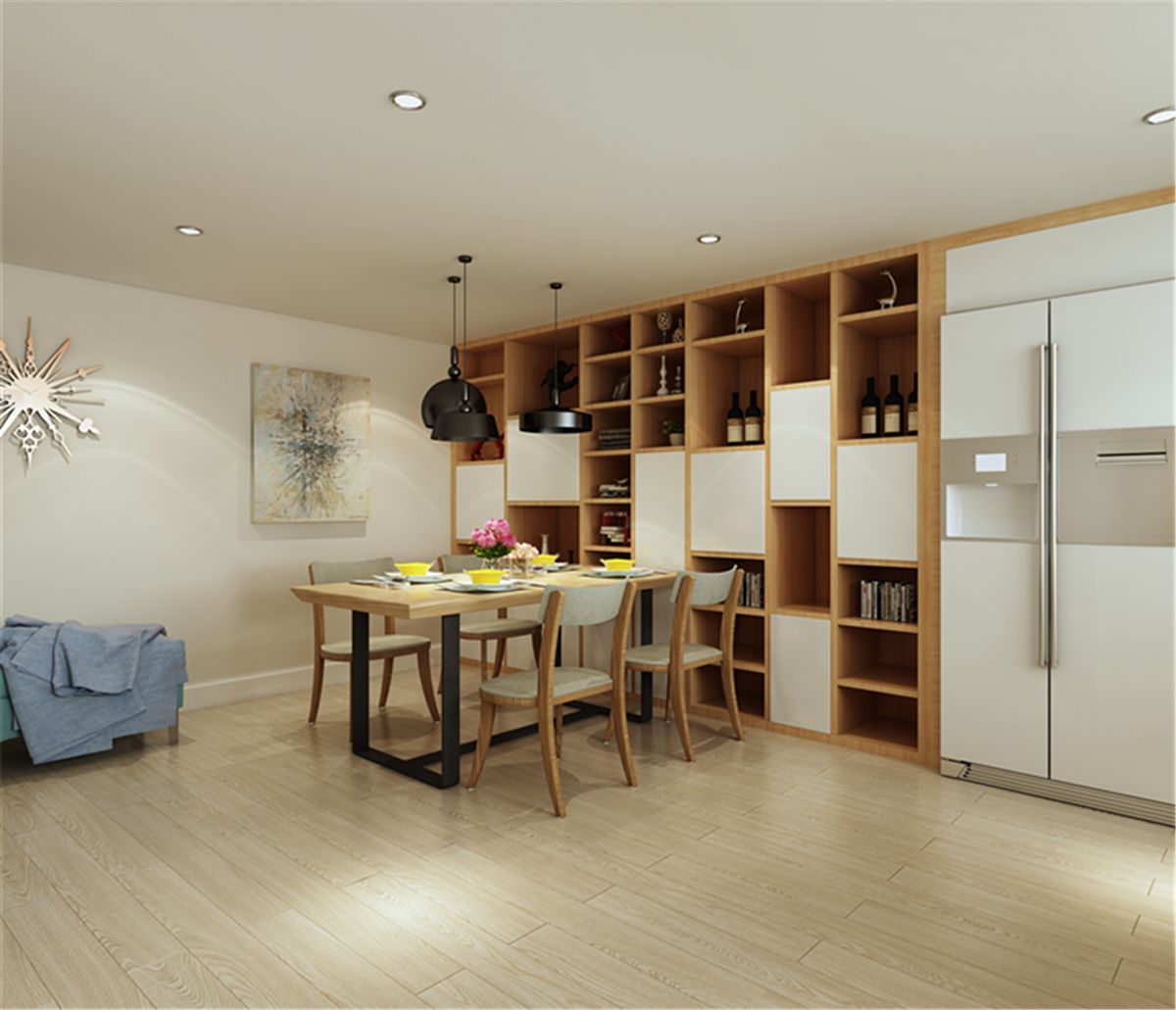 餐廳和客廳位于同一平層,更改房型時,餐廳上方搭建了2層。所以餐廳層高有限,設計的亮點是收納柜。