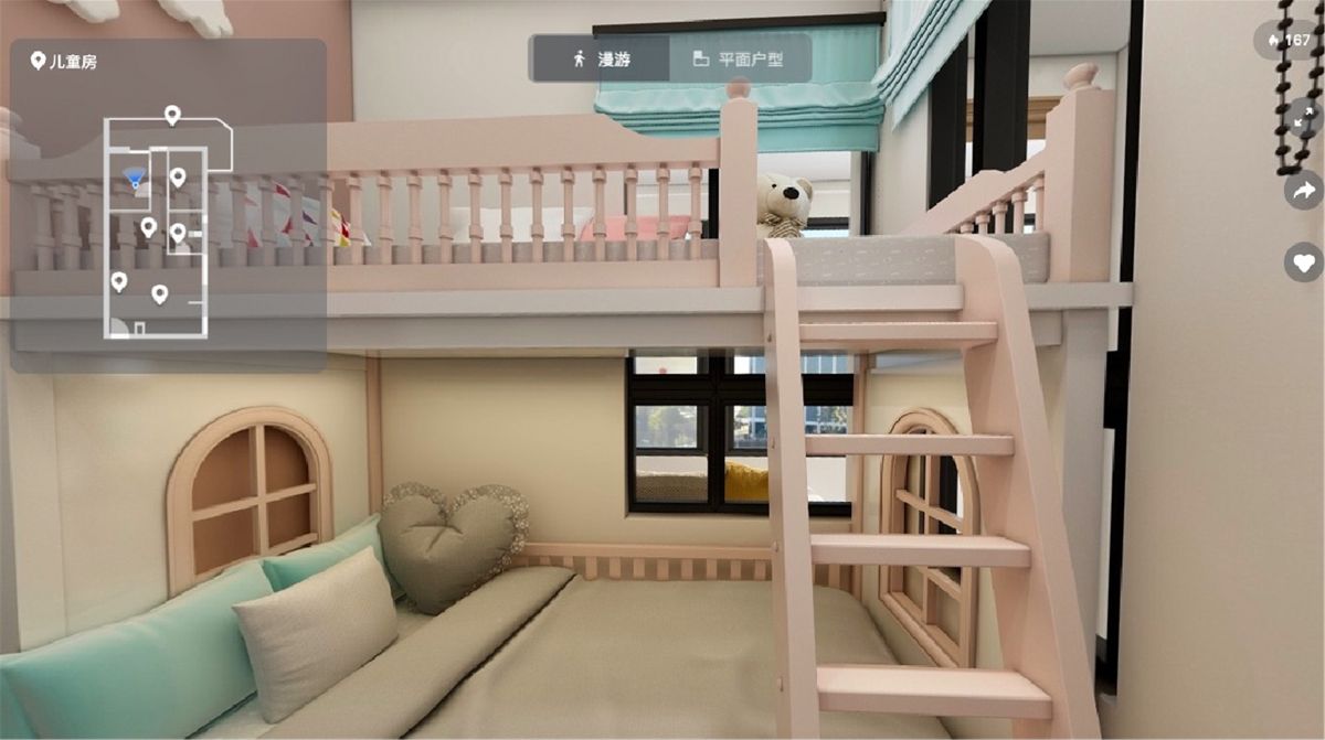 和媽媽房正對的是小朋友的房間,這兩個區(qū)域都由原來的主臥改成。因為是雙胞胎女兒,所以特別設計了上下鋪,保證兩個孩子獨立的睡眠空間,彼此互不影響。